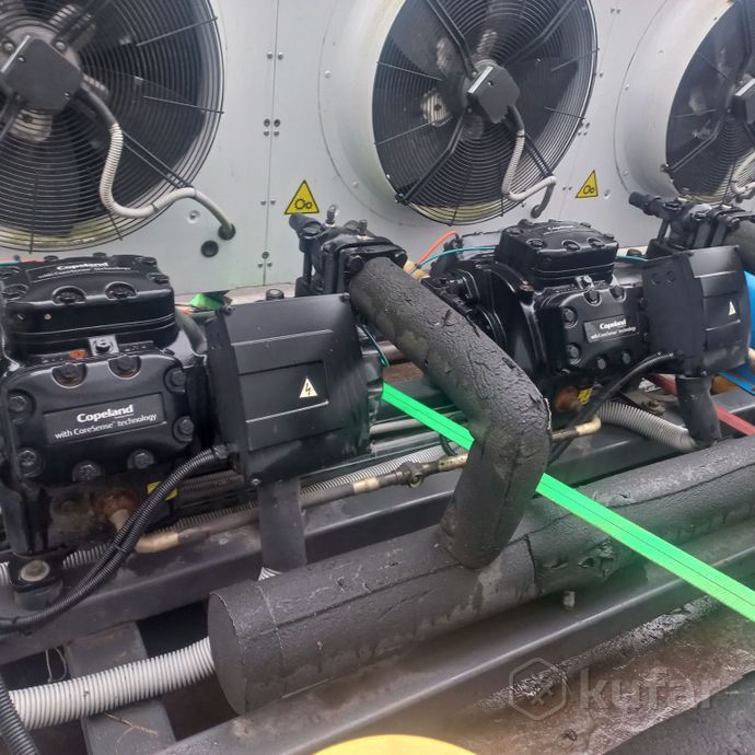 - двух полугерметичных компрессоров Copeland; - воздушного конденсатора; - ресивер для фреона на 50 кг фреона R404 или R507; - щит защитной автоматики и управления; ![]()